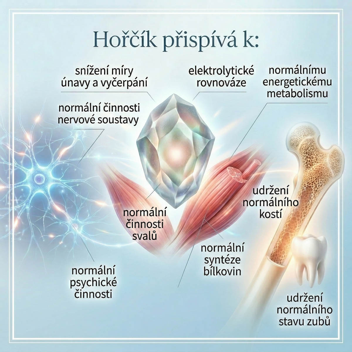 Hořčík se podílí na více než 600 biochemických reakcích v našem těle - od produkce energie a bílkovin přes dělení buněk až po správný chod nervového systému a svalů.