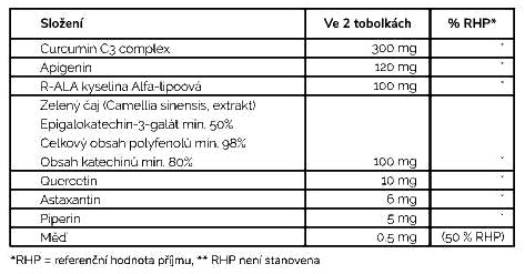 Složení: Curcumin 95% extrakt z kurkumy dlouhé (demethoxycurcumin: 15-19%, bisdemethoxycurcumin 2,5-6,5%), hydroxypropylmethylcelulóza - obal kapsle, astaxantin z mořské řasy (haematococcus pluvialis), Apigenin, R-ALA kyselina alfa-lipoová, extrakt ze zeleného čaje (carmellia sinensis L.), hořečnaté soli mastných kyselin - protispékavá látka, uhličitan hořečnatý - plnivo, sophora japonica - extrakt (95% kvercetin), měď (glukonát měďnatý).